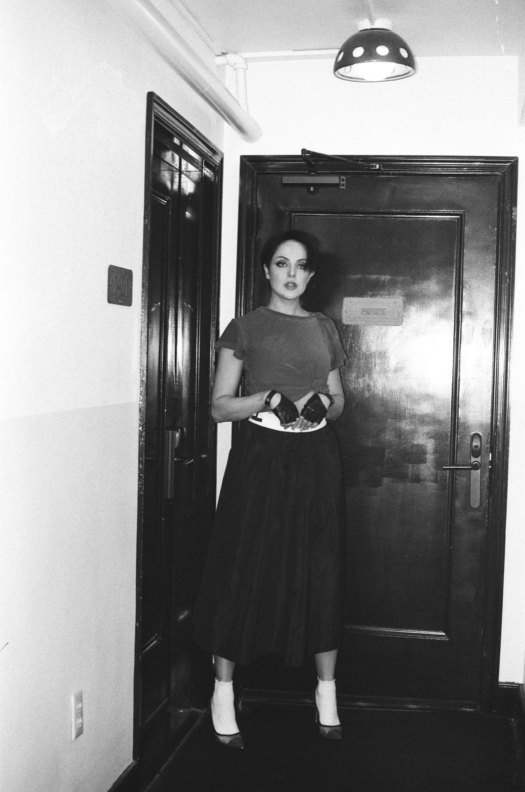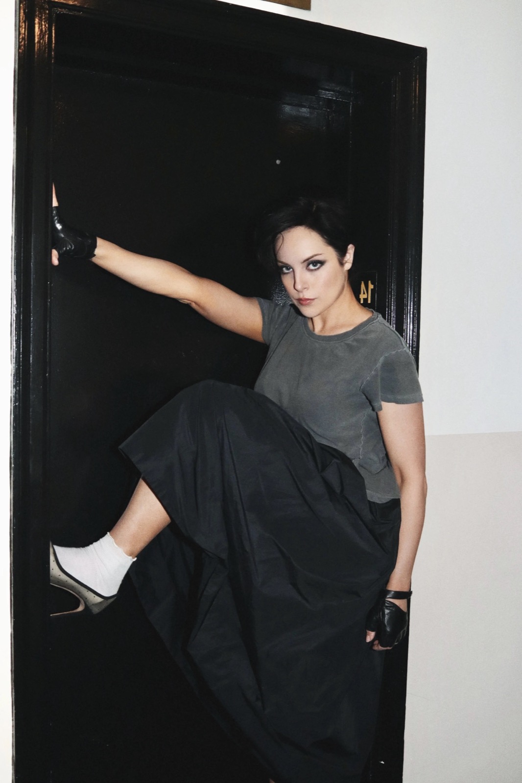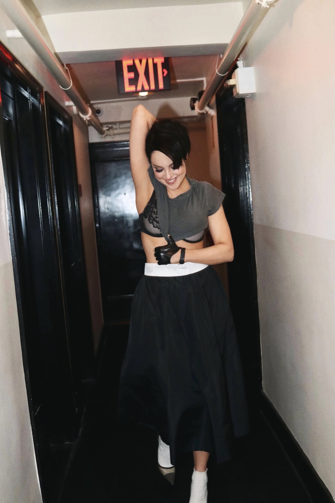 Dans un couloir étroit sous un panneau EXIT rouge, elle relève son tee-shirt, dos nu et regard sombre : on dirait qu’elle hésite entre poser ou provoquer l’alarme.