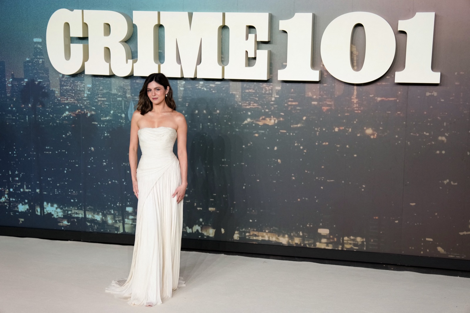 Bustier ivoire moulé, épaules nues et air très sage : à Londres pour la projection européenne de CRIME 101, elle a visiblement décidé que le vrai suspense serait sa robe.