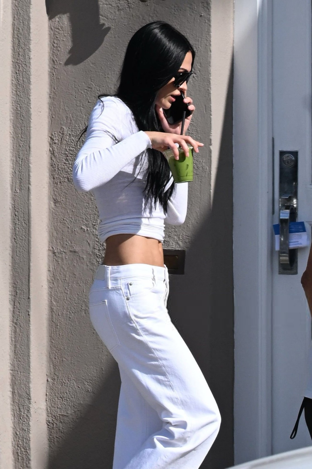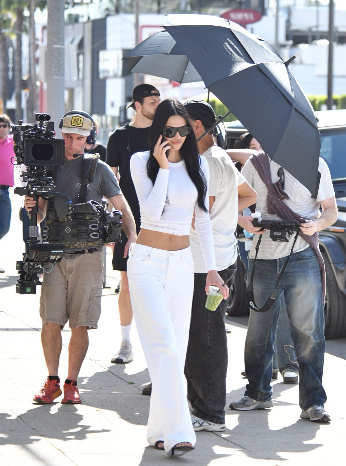 Repérée à West Hollywood pour un shooting street-style. La mannequin téléphone, coordonne l’équipe. Clin d’œil: fille de reality-TV, devenue visage fashion qui fait travailler les trottoirs.