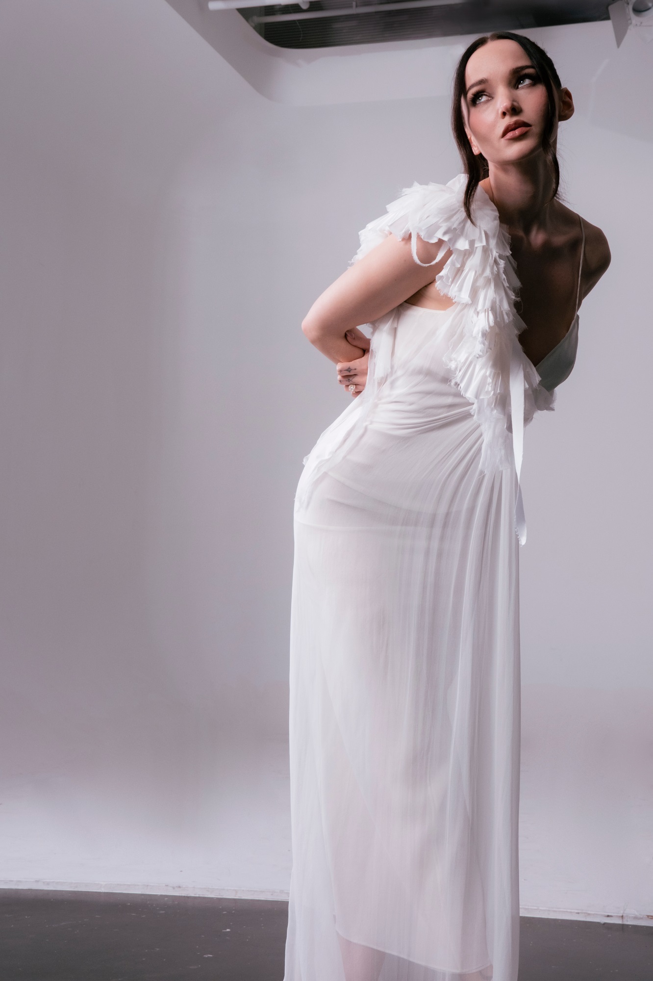 En robe transparente blanche à volants, épaules dénudées et regard félin, elle s’allonge pour le shooting de WWD en studio minimaliste. Effet vaporeux, silhouette moulée sous le tulle : on dirait un nuage… qui sait très bien ce qu’il fait.