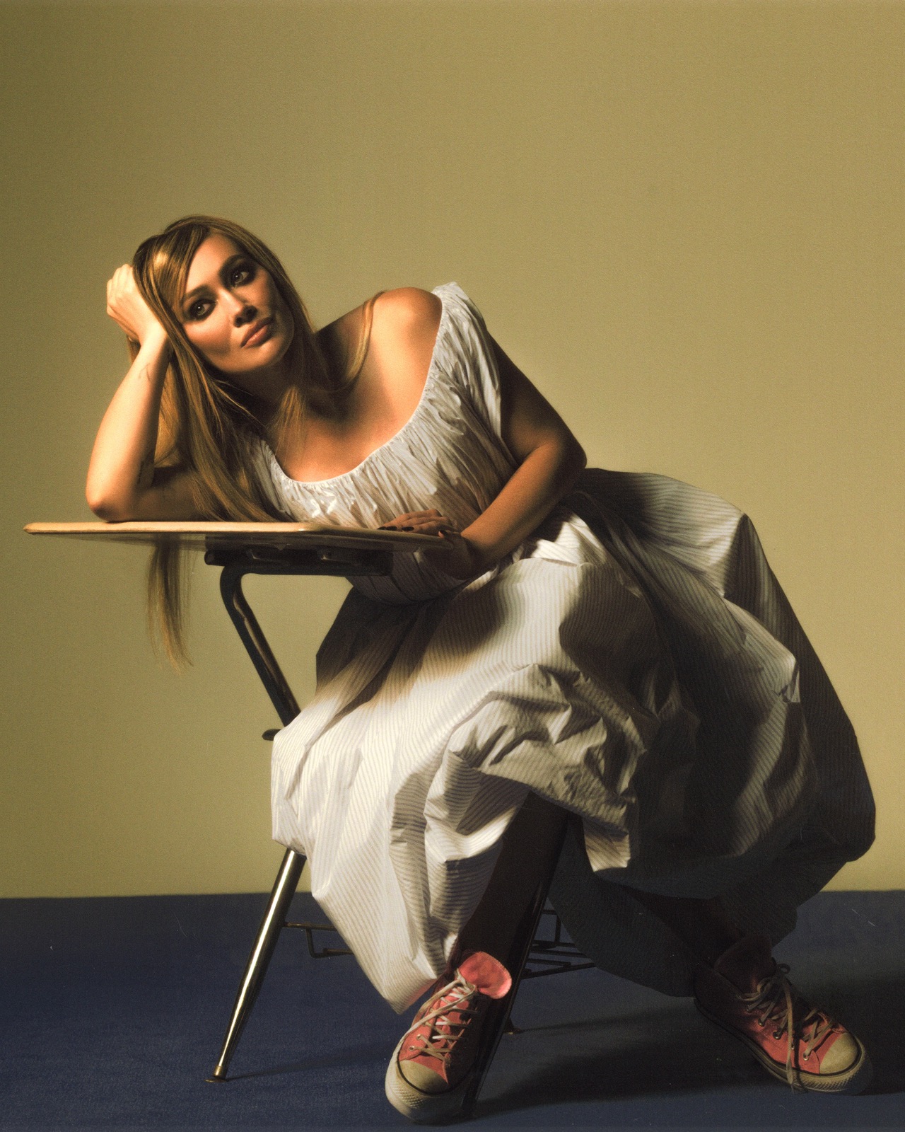 Actrice et chanteuse devenue élément clé de sa carrière pop culture, elle enchaîne poses allongées et regard smoky. L’élément marquant, c’est l’attitude cool : robe vaporeuse, baskets usées, et studio transformé en fantasme arty.