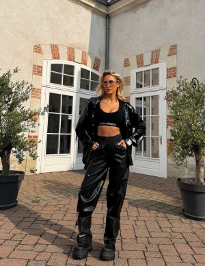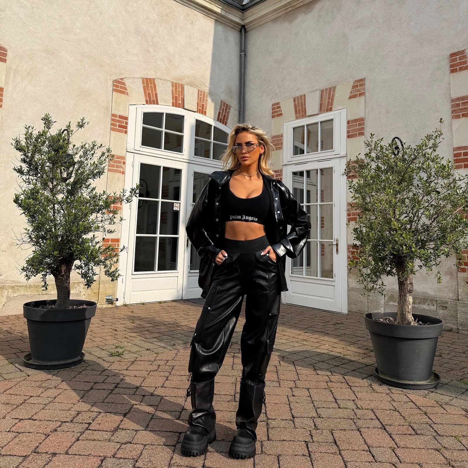 (8 photos)Elle relève son col comme si elle préparait une tempête intérieure — et pour une fois, c’est le cuir qui a peur.