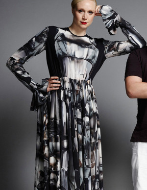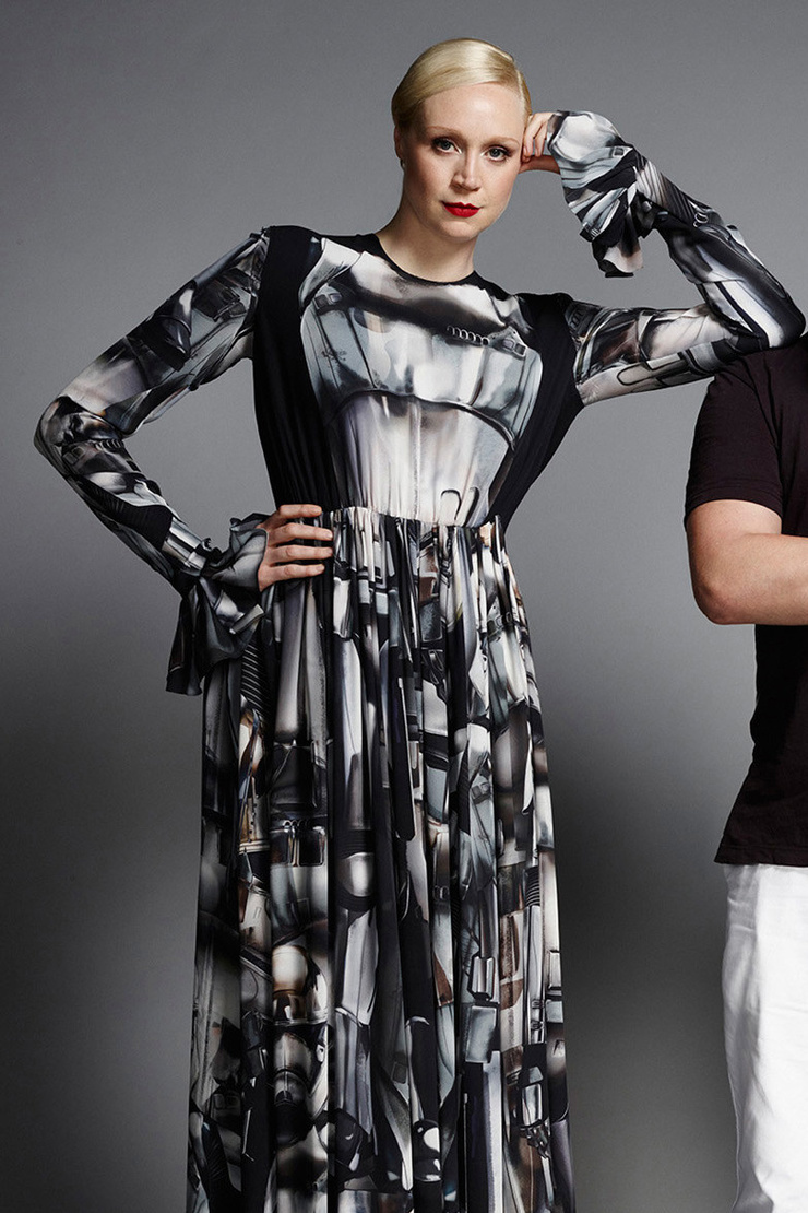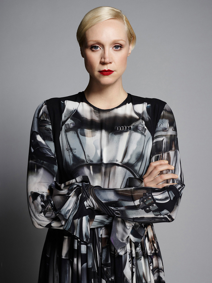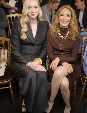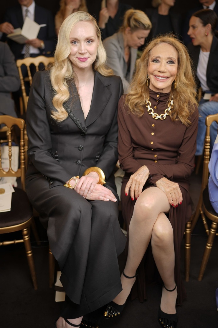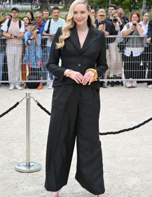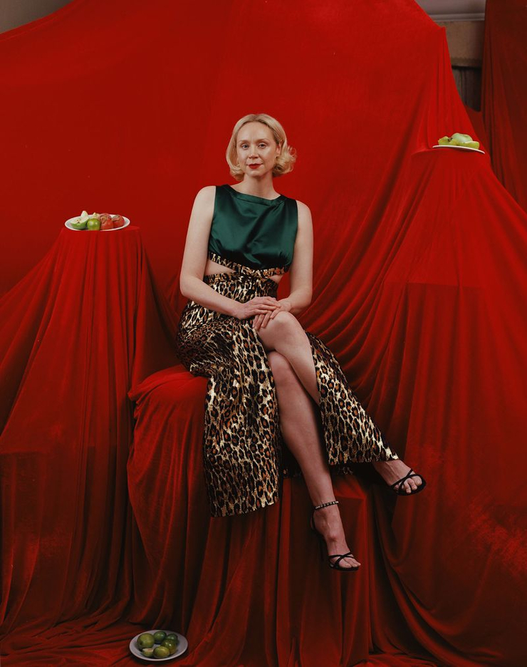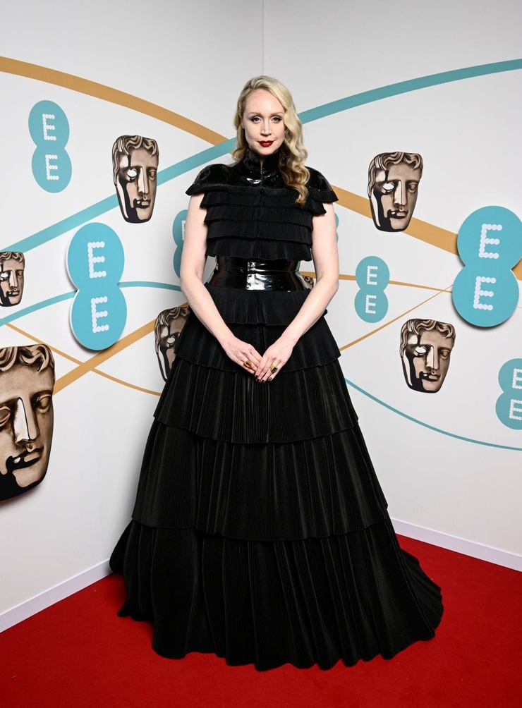 (2 photos)Son décolleté géométrique a l’air de défier le mur rouge, comme si elle testait la température du glamour.