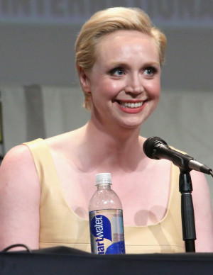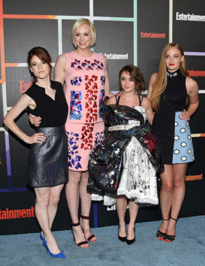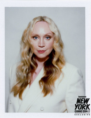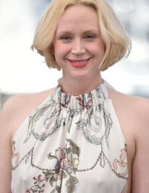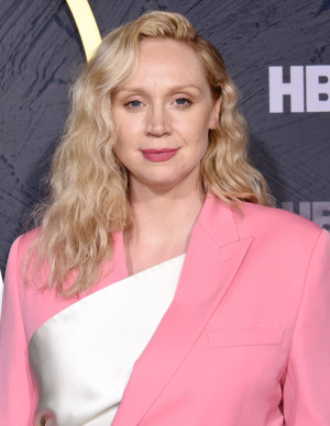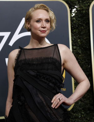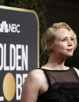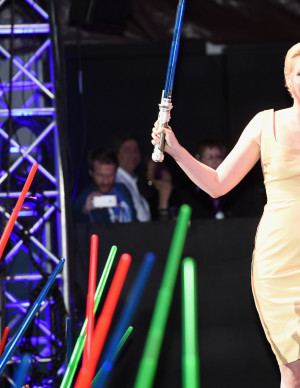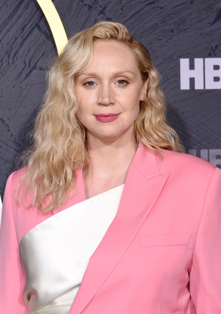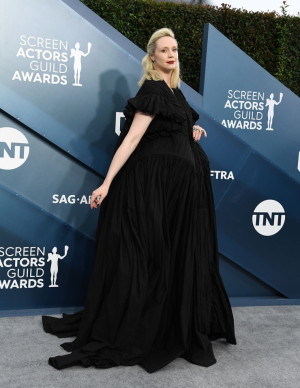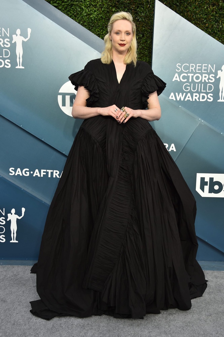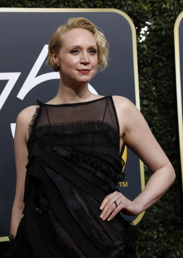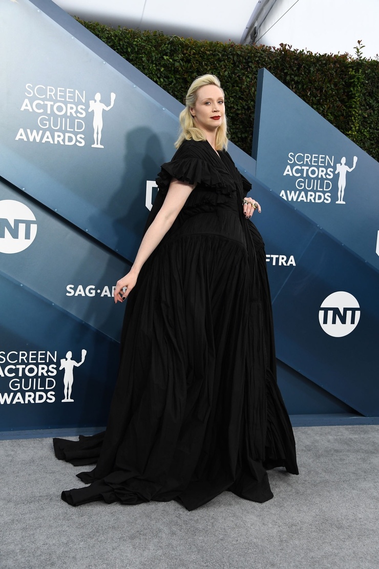 (12 photos)Sa robe dorée brille tellement qu’on dirait qu’elle essaie d’éclipser le logo géant derrière elle.