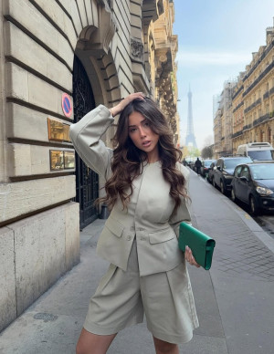 (7 photos)Fauteuil mou, regard affûté, robes qui glissent : elle pose comme si le temps devait s’excuser d’exister.