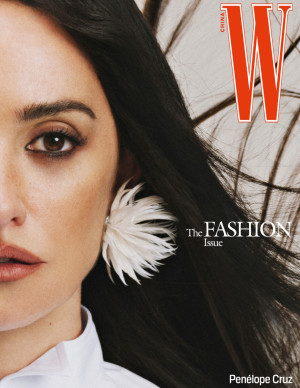 Penélope Cruz couvre W China, plume, jambe, regard dangereux